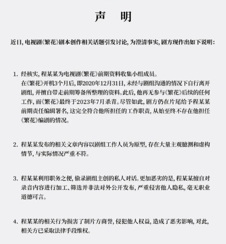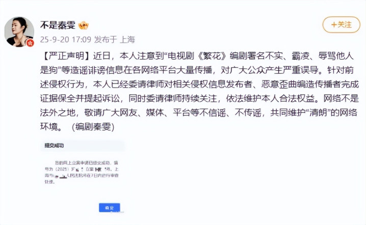 秦雯也转发官方声明,大大方方承认自己是《繁花》唯一的编剧。