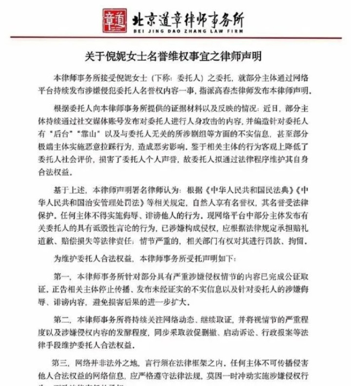 质疑倪妮有“靠山”,也被当事人公开声明维权。